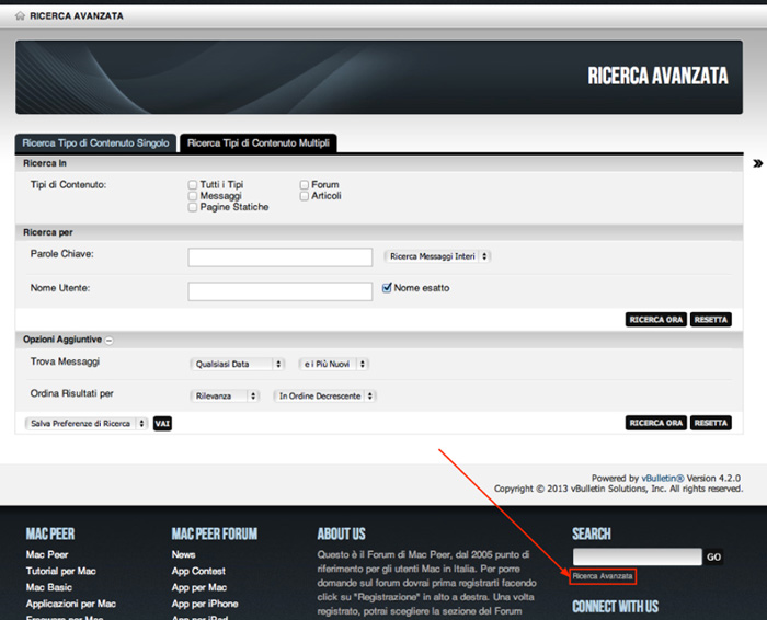 Il forum e il sito di Mac Peer sono dei ricchissimi contenitori di informazioni, suggerimenti e spiegazioni che possono risolvere la maggior parte dei problemi e dubbi che si incontrano solitamente, senza dover aprire necessariamente nuovi topic, oppure per proseguire in quelli adatti e già aperti in precedenza da altri utenti. 1) In basso a destra in ogni pagina del forum è possibile utilizzare il campo "search", molto comodo per ricerche veloci..